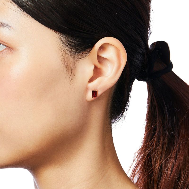 ガーネットのバゲットカットピアス。ガーネットの深い赤が顔回りを華やかに演出してくれます。オフィススタイルのアクセントに、またカジュアルスタイルをエレガントに魅せてくれる便利なアイテムです。