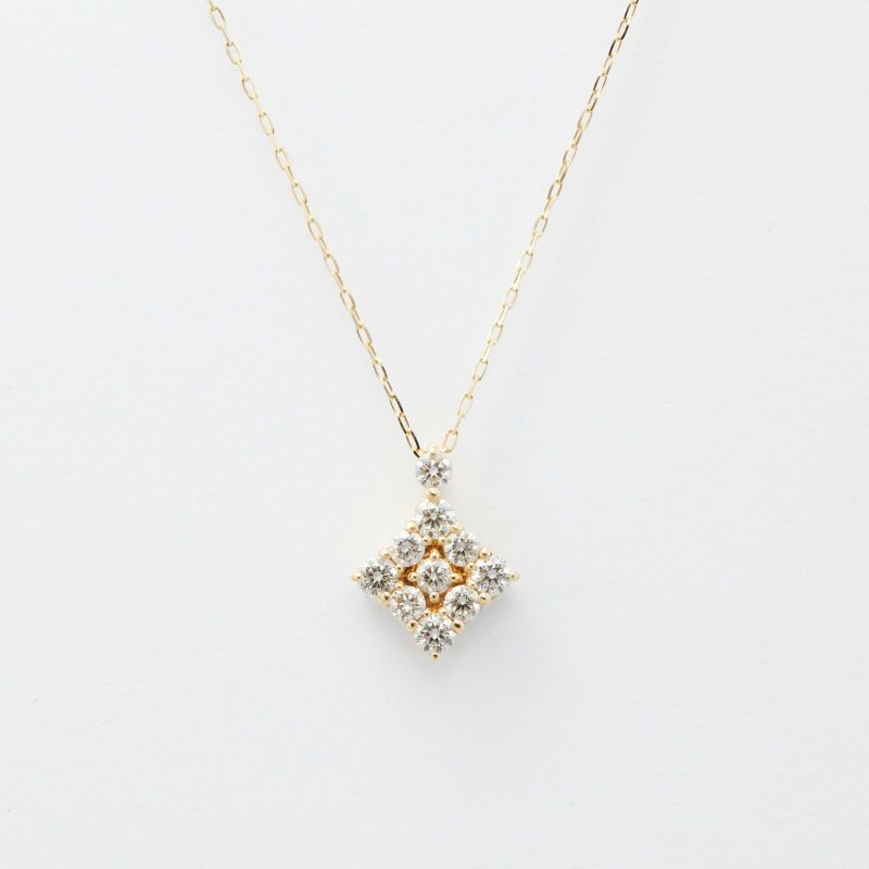 K18 イエローゴールドのダイヤモンドネックレス。留め具部分にもダイヤモンドがついた華やかなデザインのアイテム。合計0.28ctのダイヤモンドが美しく輝く華やかで上品なネックレスです。