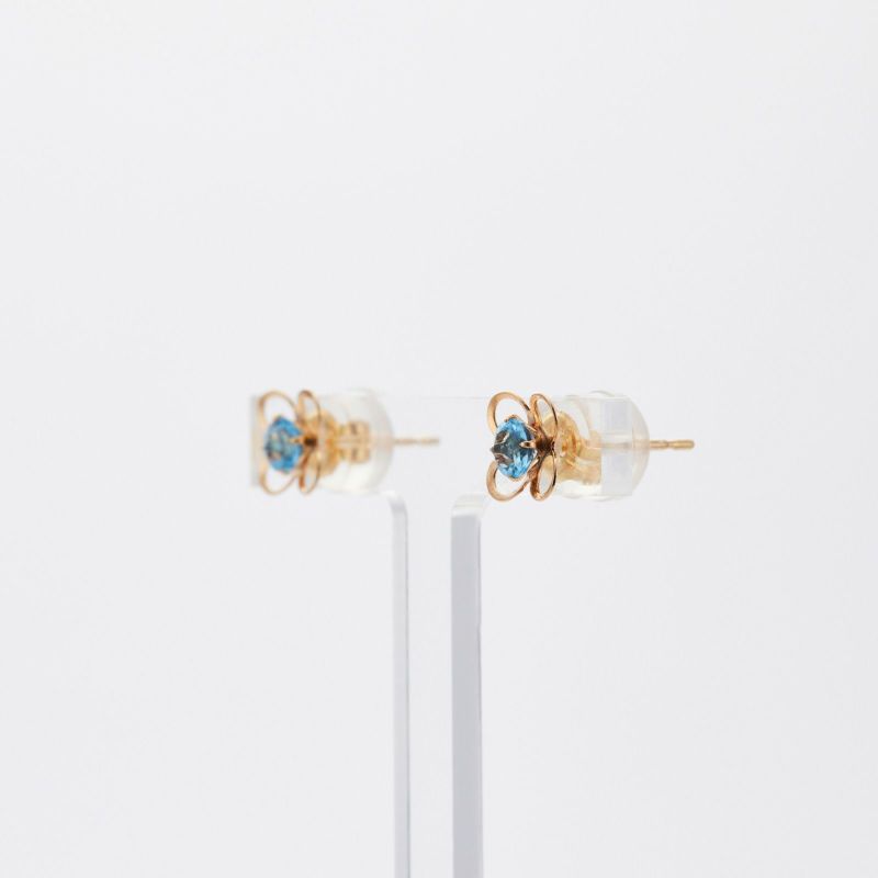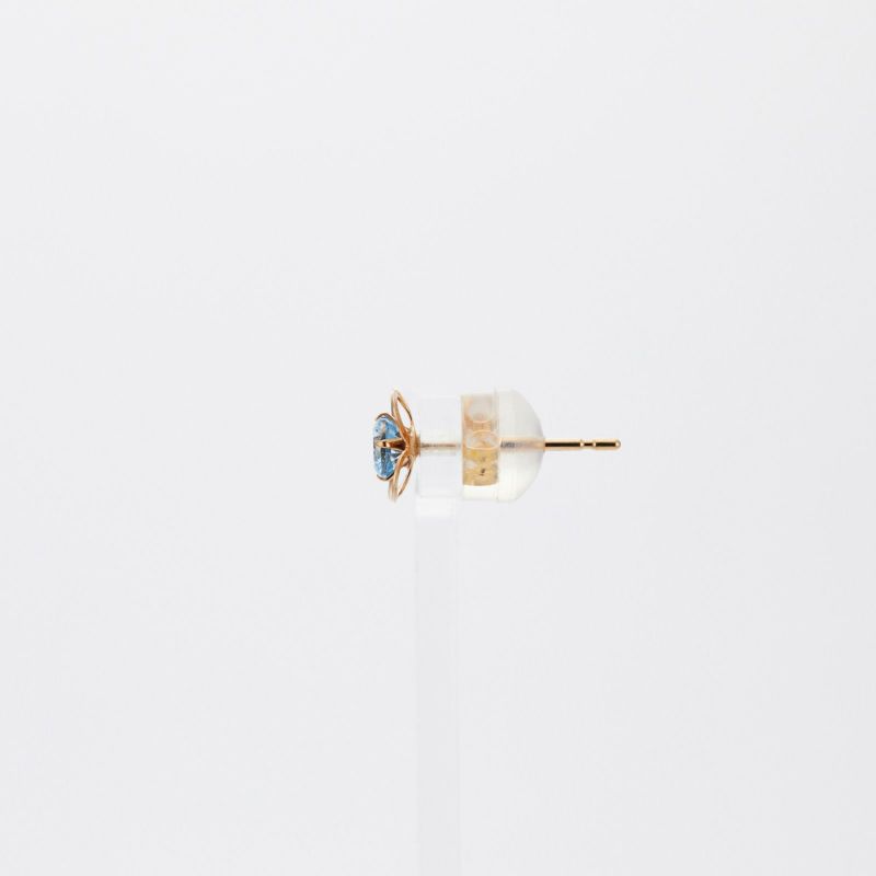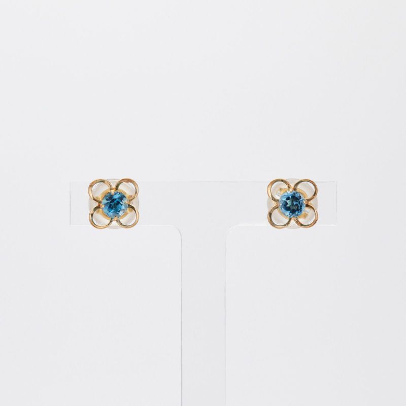 K18イエローゴールドのフラワーモチーフデザインのピアスです。4枚の花びらの中心にラウンドのブルートパーズが彩りを添えています。爽やかな色合いが素敵なピアスです。